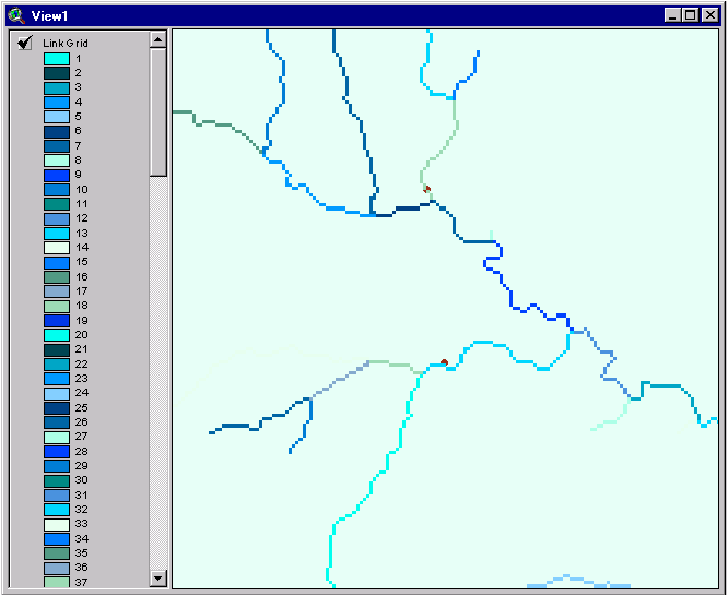 E. Finding Link Outlets Further preparation for the HEC-HMS requires ArcView to pinpoint the end of each link. This is done by choosing Hydro/Outlets From Links from the main menu. For the input, type in the names of your flow accumulation (colfac) and link grids (collnk); for the output name, choose something reasonable (colout). The resulting grid is a scattered set of single cells, each the farthest downstream cell of a stream link. Notice that each link has its own outlet. Zoom in to see how the outlet cells lie right at the end of the links. Pretty neat!