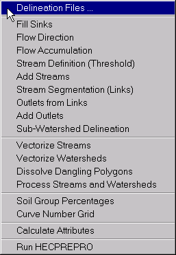 Except for a few items, we will systematically march through the selections in the menu to achieve the conversion from the DEM to a HEC-HMS input file. The following list is a summary to give you a background as to which each step accomplishes: