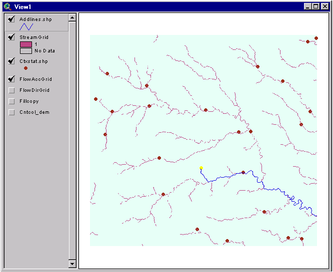 Since we recently added another stream segment to the existing network, ArcView now thinks we have two stream coverages when in reality we wish to have one. To circumvent this problem, select Hydro/Add Streams and then enter the proper names for input themes one through three (Addlines.shp, colfdr, colstr). Finally, select an output theme name (colstr1) and click on OK. In addition, select YES when asked if you want to use traced and threshold streams. Notice that your new modified stream grid is a combination of the old stream grid (created from the cell threshold) and the new stream grid (created when we added a point in the coverage).