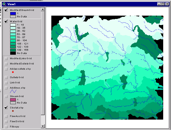 As an example, the graphic below contains sample results to this point. Note that the watershed colors have been changed to greenish and the stream grid has been changed to blue.