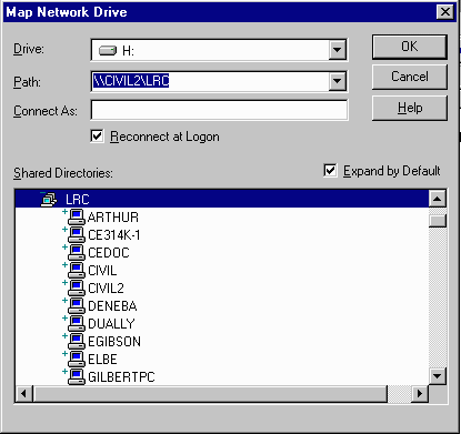 Logon to the computer of your choice and make a directory in your workspace for this exercise. I've saved the needed files in the class directory (Civil2/LRC/Class/Maidment/giswr/basemap/). To be able to access them from ArcView, you'll first need to map the network drive. To do so, open Windows Explorer, and under Tools/Map Network Drive and choose "H:" as the drive, and "\\CIVIL2\LRC" as the path.