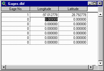 Go down into the table and you'll see a little hand and finger appear. Use this to click on the record whose value you want to fill in. Now you may enter the data: the gage sequence # (i.e. 1, 2, 3, 4,...) and the longitude & latitude coordinates converted to digital degrees. Continue adding the data values until they are all done.