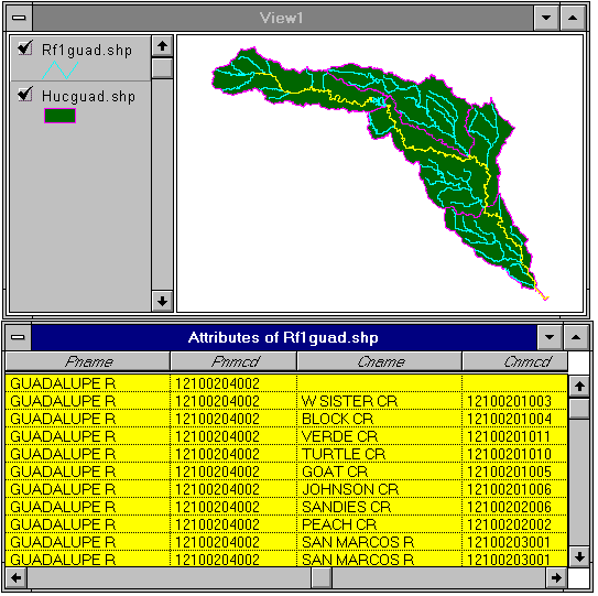 Use Theme/Convert to Shapefile to produce a new theme. Name this theme hucguad.shp and save it in your local workspace for this exercise. You will be prompted to whether add this theme to the View. Do so, adding it to View1 (not New View). If you click on the theme button for hucguad, you'll see that it looks identical to the earlier huctx theme selection for the Guadalupe basin. But the new hucguad shape file is much smaller. A Shapefile is a special simplified file structure for storing geographic features in Arcview. It can be converted to an Arc/Info coverage using the Arc/Info command Shapearc if necessary.