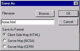 Your last step is to save your work. Select Save as under File. Select Sever Map (NCSA) as the format. Your file can then be saved as a .map extension. It is best to name your .map file the same as your html document or image. This will help you when you have several Clickable maps.