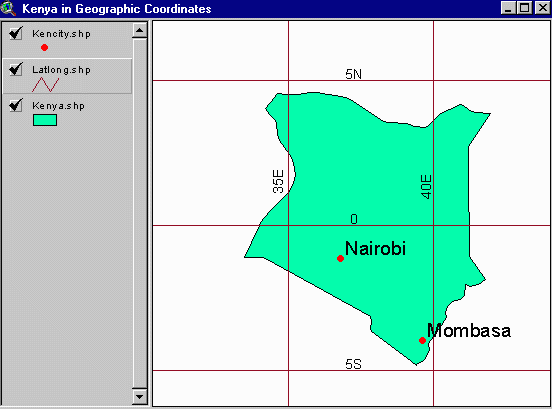 Create a new View (View3), add afrbord.shp and latlong.shp to it, and select Kenya as before.