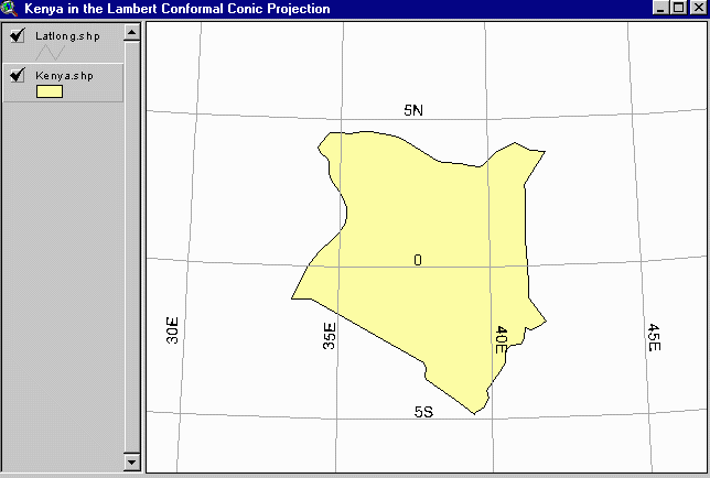 To view Kenya in the Lambert Conformal Conic projection, highlight the afrbord.shp theme, go to View/Properties, set the map units to Decimal Degrees, and click on the Projection bar, click on Custom and in the Projection Properties window displayed, select Projection: Lambert Conformal Conic. Set the Central Meridian to -7, set Standard Parallel 1 to 29, Standard Parallel 2 to 34.5, and the reference latitude to 25. Click OK at the two display windows to transform the view to the projected domain. Notice how the meridians now fan out from an origin at the center of rotation of the earth (a consequence of using a conic projection centered on the axis of rotation of the earth). The display shown is that which would be produced by cutting the cone up the back side and unfolding the cone so that it lays flat on the table.
