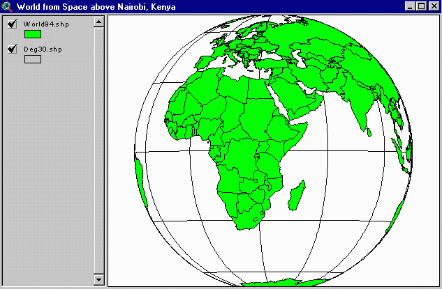 Go to the View/Properties sequence and this time under projection Type, select View from Space (the last option in the list of Projections of the World). You'll see a nice 3-D view of the globe as seen from a viewpoint above Massachusetts, USA. If you want to see how the world looks when viewed from above Nairobi, Kenya, go back to the projection selection window, click on Custom and then type -7 for the Central Meridian and 32 for the reference latitude (the projection name changes to "Orthographic" when you do this). And there is the world centered on Nairobi, Kenya! Change the view name to World from Above Nairobi, Kenya using the same procedure as before.