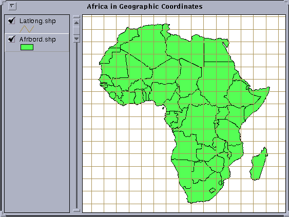 Create a New Project by hitting File/New Project. Save changes to your previous project if necessary before it is automatically closed out. Open a new View. Add the themes Afrbord.shp and Latlong.shp to the View. These are an outline of African countries and a 5 degree grid of latitude and longitude as a line theme. Position the latlong theme above the Africa theme so that you can see the grid overlying the continent. Here is an image of what you should see: