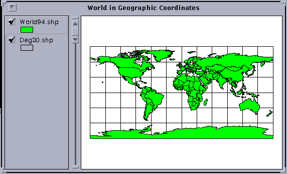 Make a new View by hitting New in the Project window while the View icon is highlighted. This should result in the creation of a new View window labeled View2. Add the themes World94.shp and Deg30.shp to this view as before.