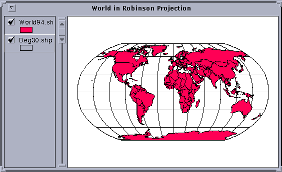 Go back to View/Properties and reproject the View into the Robinson projection. Here is an image of the world in the Robinson Projection. To label your view World in Robinson Projection like that shown in the picture, use View/Properties to change the Name field, as before.