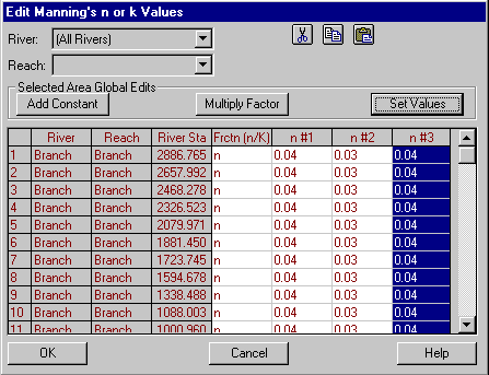 We are going to set the values for the Manning coefficients. Select Tables/Manning’s n or k values from the Geometric Data window. The Edit Manning’s n or k Values window will appear. First choose the value (All Rivers) in the River drop box. Click on the n#1 box to select the entire column and click the Set Values button. Type a value of "0.04" and click OK. Repeat this process for the n#2 column entering a value of "0.03" for n, and also for the n#3 column choosing a value of "0.04". The window should look like this: