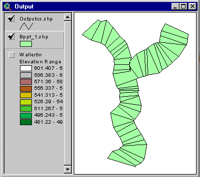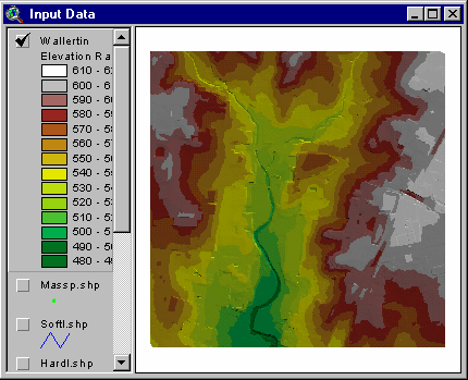 Click OK and type "wallertin" when asked for the TIN name. After some calculations, the TIN theme will be added to your view. Click the check box to display it. The default color scheme is not ideal for observing the TIN. Double click on the TIN’s legend bar to open the TIN legend editor. First click off the check box next to Lines and then click the Edit button in the Faces part of the window to open the regular legend editor. Click on the Load button and choose terrain.avl from your working directory. Click OK twice in the Load Legend windows and Apply in the legend editor. Your TIN should look like this: