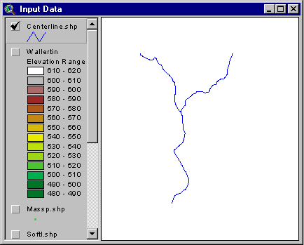 With the view window active, select Add Theme... from the View menu. Choose centerline.shp from your working directory and click OK. If you click off the check box of the TIN your view should look like this: