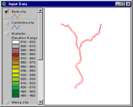 Close the table and repeat the previous process to open the banks.shp theme from your working directory. If you click off the centerline your view must be like this: