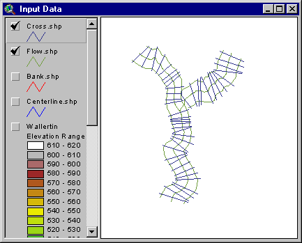 Open the shapefiles Flow.shp and Cross.shp following the same procedure. If you click on these new themes and click off the banks theme your view will be like this: