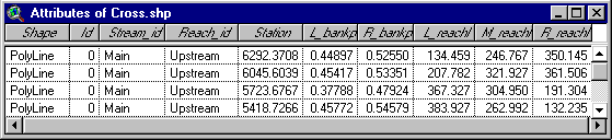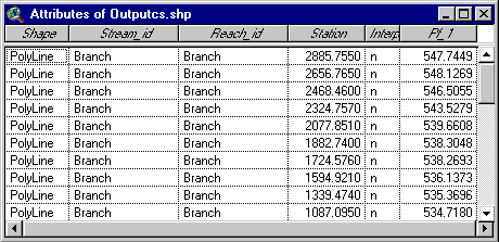 Each cross-section now contains the stream and reach identifiers, station number, a field indicating if the corresponding cross-section was interpolated by HEC-RAS or not, and fields (in this case just one) specifying the water surface elevation in feet as was defined in the RAS GIS Export File.