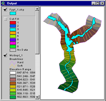 Select Floodplain Delineation from the Ras-AV menu. Close the information window by clicking OK and change the legend of the Fppf_1.shp theme to make it look like water. You should be able to see something like this: