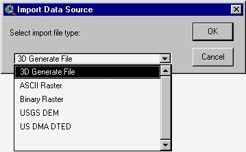 With the new view active, import the data stored in the GENERATE files using File/Import Data Source... and choosing the 3D Generate File from the menu. Notice that ArcView allows you to import data stored in different formats. Click OK to confirm your selection.