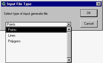 Choose Points as the type of input generate file you are importing and click OK. Select the file massp.pnt from your working directory and click OK again. From the new window, type massp.shp as the name of the output shapefile. You can click OK one more time to start importing the file. Select Yes to add the shapefile generated to the View.