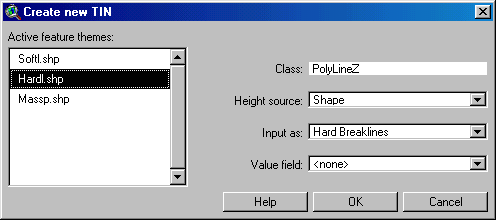 The next step is the generation of the TIN. Select the three themes you just created, go to Surface menu and the click on Create TIN from Features.... The Create new TIN window will appear and you will have to specify the following fields for each active theme: