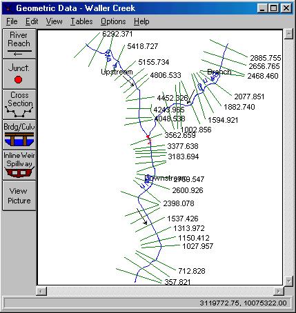 We can keep on going and import the geometric data stored in RAS GIS Import format that we created with AVRas. Select Edit/Geometric Data… from the main project window and File/Import Geometry Data/GIS Format… from the Geometric Data window. Choose the file waller.geo from your AVRas working directory and click OK. The resulting view shows the schematic of Waller Creek.