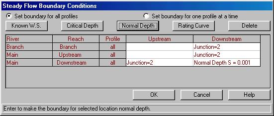 Click on the Reach Boundary Conditions button. The new window is used to set the water surface elevation boundary conditions. We will use the normal depth option. Click in the last cell of the Downstream column an then click on the Normal Depth button. Set the energy slope at the boundary to "0.001" and click OK to confirm this value.