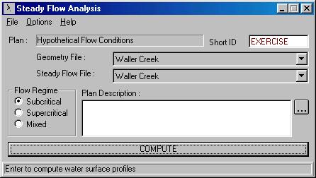 Now that the geometry and flow data have been set we can execute the model. Select Simulate/Steady Flow Analysis… from the project window and define a new plan - to specify the files to be used in the simulation- with File/New Plan. You will be subsequently asked to provide a plan title (i.e. Hypothetical flow conditions) and a 12 character short identifier. Click OK twice to confirm your selections.