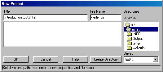 Go to File/New Project to define a new project. Select your working directory and then type the title "Introduction to AVRas" and the file name for the project "Waller.prj". Click OK and a window will open confirming the information you just entered. Click OK one more time and check that the Project line in the main project window is now filled with information.