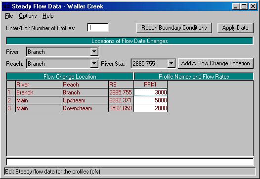 Select Edit/Steady Flow Data… to start introducing flow values and fill the PF1 column as shown below.