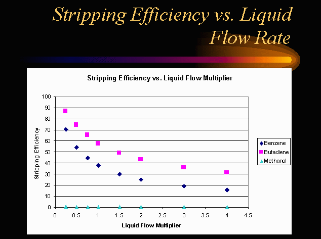 Shown is the effect of liquid flow rate on the stripping efficiency. The liquid flow multiplier on the X-axis is the number by which the baseline flow rates were multiplied. The trend in the data is consistent with the expected trend.