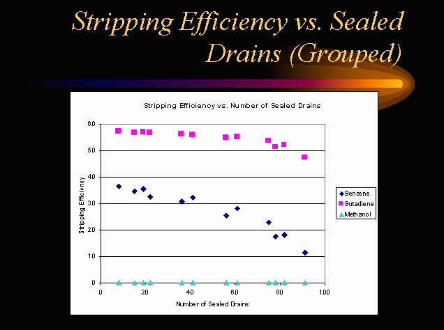 The scatter in the data in Slide 22 (most evident for benzene) contrasts the consistent trend of the data in the above slide. The contrast implies that the choice of placement of seals can affect VOC emissions. The variation of effect on stripping efficiency implies an optimal placement of seals may be possible, but determining the optimal condition would be difficult. However, the variation seen with grouped placement is relatively small. This implies the effect of sealed drain placement is small compared to the effect of increasing the number of sealed drains.