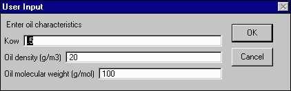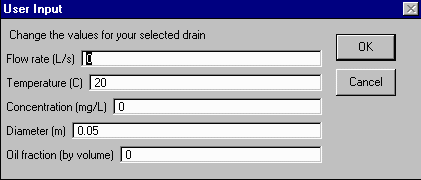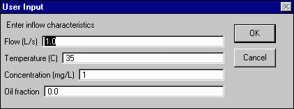 If you have selected other flow, you will be asked to enter the flow data for that inflow. Enter the flow rate (L/s), temperature (0C), concentration (mg/L), and the oil fraction. Hit OK.