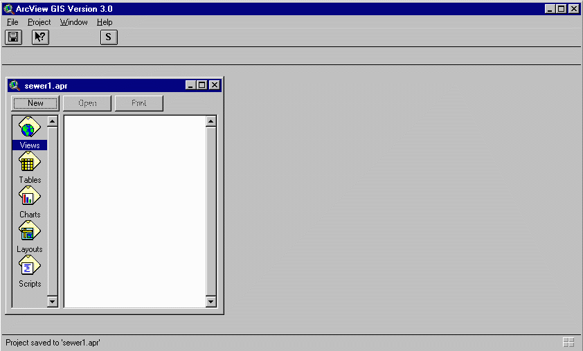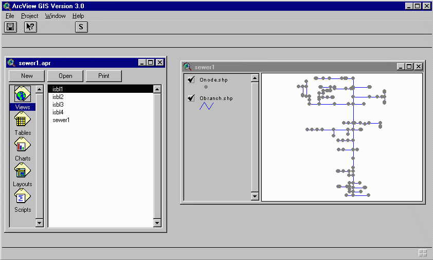 The first time you work with your sewer network in ArcView, you will want to open a project specifically for that network. To open the ArcView project, open ArcView and go to File/Open Project. Select the project nautilus.apr.