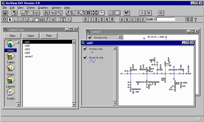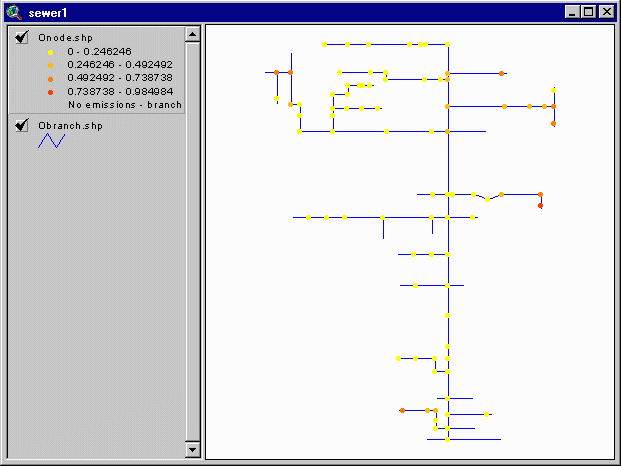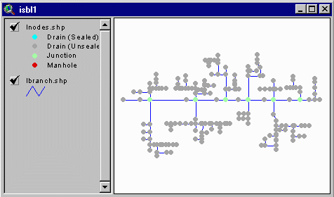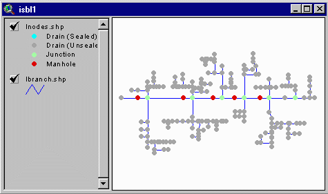 the top left of the screen. This adds your OSBL and ISBL GIS files to the project. A View window will open, displaying the map of your OSBL unit. The window name is identical to the name you saved your project under. The reaches/branches are shown in blue and the nodes (junctions, manholes, and pipe endings) are shown in gray.