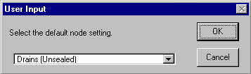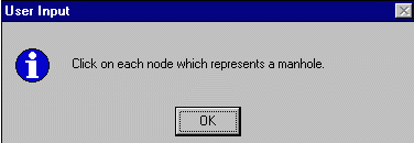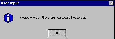 ArcView will then prompt you to click on a drain to edit. Click OK, then click on a drain for which you would like to change either the sealed/unsealed status or on a drain where you wish to enter flow data. When you have completed the changes to a node, click on node you wish to alter.