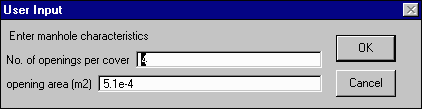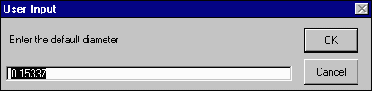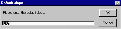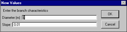 The values which appear in the input box are those which are currently assigned to the branch you selected. Initially, these will be the defaults you just selected. Enter the new branch diameter in meters and the new branch slope. If either or both of the values are already the values you desire, simply click OK and move on to the next branch you wish to edit or move on to the next step.