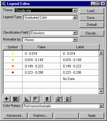 The legend editor allows the user to add or delete ranges from the default display of emissions. It also allows the user to display values for branches and values other than emissions for nodes.