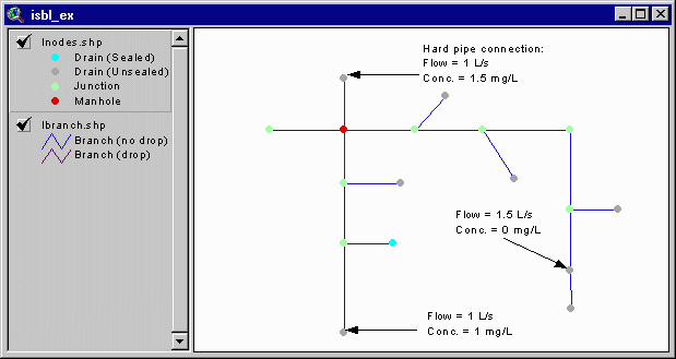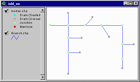 Notice that the legend for the theme "inodes" has changed. Four different kinds of nodes are listed in the legend (at the left portion of the view window). Look at your ISBL network. Notice that all initial nodes are gray, indicating unsealed drains. All of the internal nodes should be green, indicating they are junctions.