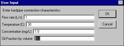 button. Click OK at the prompt. Click on node 1 and enter the following data: flow = 1 L/s, temperature = 30 oC, concentration = 1.5 mg/L, oil fraction = 0.0.