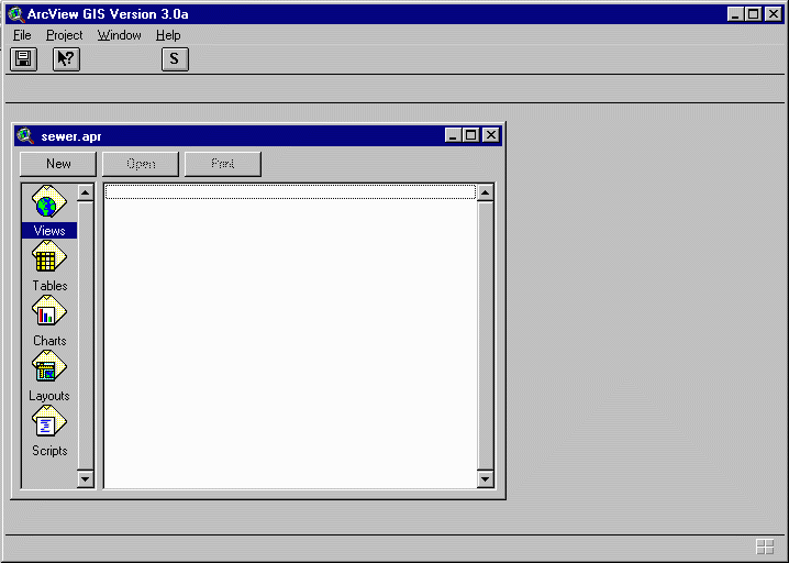 Once your files are set up, start the application ArcView. Open the project, nautilus.apr. From the menu bar, go to File/Save as. Save your project as sewer.apr. (This name is used for simplicity and uniformity in the exercise. For original networks, name the project as appropriate to the OSBL unit. The name given to the project will also be given to the OSBL view window.)