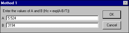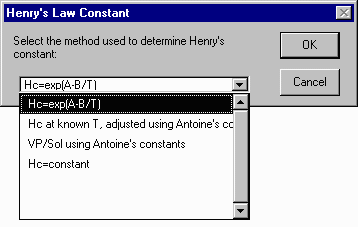 ArcView will then ask you to select the method of calculating the Henry's law constant. As for the ISBL unit, select method 1 (Hc = exp (A-B/T)). Enter the same values you input for the ISBL unit.