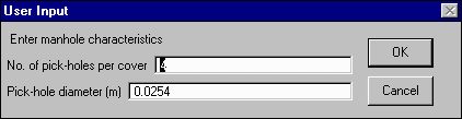 button at the upper right hand portion of the screen. ArcView will prompt you to enter data on the number of pickholes per manhole cover and the area of the opening. Accept the default values and hit OK.