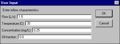 Click on node 10. Again, you will be prompted to indicate the type of flow at the node. This time, select Other Inflow. Enter the following flow characteristics: flow = 1.5 L/s, temperature = 35 oC, concentration = 0.25 mg/L, and oil fraction = 0.0. Then hit OK. This data will now appear in the table OINFLOW.DBF.