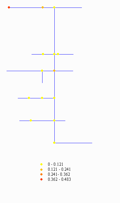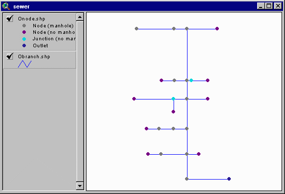 Notice that the outlet (located at the bottom right of the image) is colored in dark blue, and nodes at initial branch ends are purple (no manholes). All other nodes are gray, indicating a manhole location.
