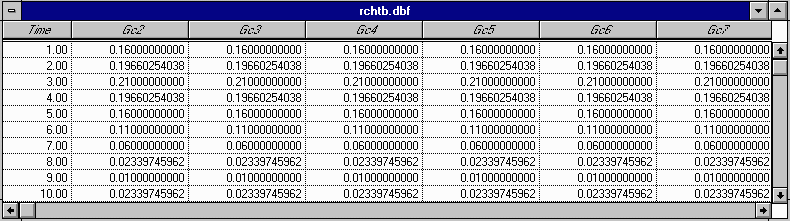 An alternate database structure must be used to address parameters that have multiple values for a single feature, such as time-series data. The model must be able to quickly store and retrieve this information as the simulation progresses. The Map-Based Groundwater Model solves this problem by creating a single table for each attribute (parameter). The table is organized such that the columns correspond to specific features and the rows correspond to different time increments. As a result, the information for a specific feature during a given time step is one-to-one, allowing the program to retrieve the data as if it were a single-valued parameter. In Figure 2, the time-series table shows the recharge rate for different groundwater cells over a ten-day period.