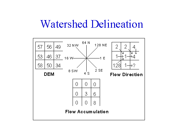 - Flow Direction grid assigns a value to a cell indicating the direction of steepest descent