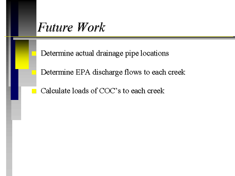 In future work, I am going to determine the actual locations of those pipe drains between tank areas so that a more appropriate flow model can be developed. As I previously mentioned, I am going to figure out the NPDES discharge flows, and then eventually come up with some loads for different chemicals of concern to each creek.