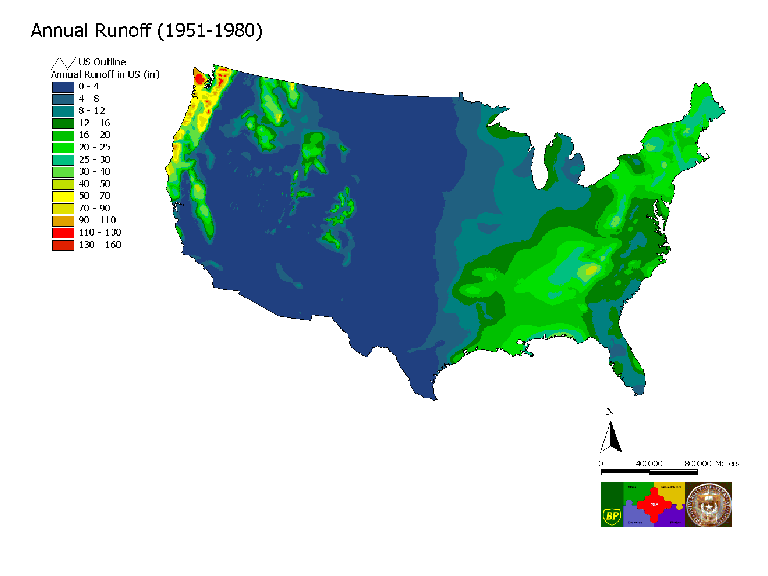 Annual Runoff: Interpolated grid of annual runoff measurements for the United States constructed using the USGS contour map of annual runoff measurements from 1951-1980.
