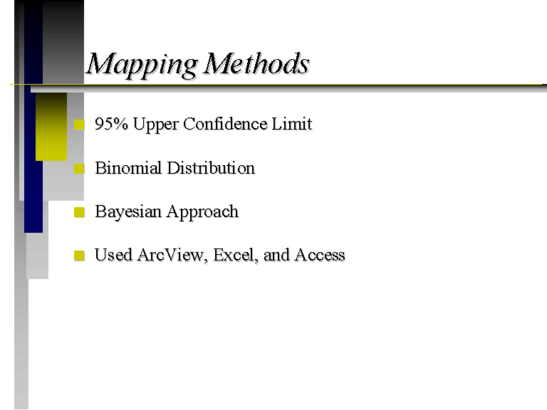 The 95% Upper Confidence Limit calculates a representative concentration for an area. The Binomial and Bayesian methods calculate the fraction of soil groundwater in an area that will be above a target level, such as an RBSL. These maps were developed using ArcView, Excel, and Access. For more information on connecting ArcView with Access, please visit the exercise Mapping Environmental Data Stored in Microsoft Access at http://www.ce.utexas.edu/prof/maidment/giswr98/riskmap/webfiles/riskmap.html