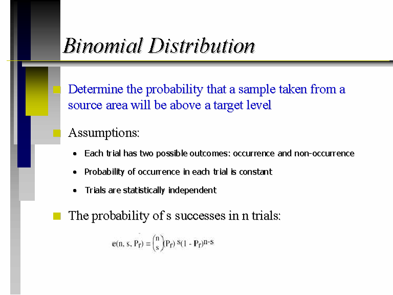 The binomial distribution method can be used to determine the probability that a sample taken from a source area will be above a target level. The distribution is based on a Bernoulli Sequence which assumes that each trial has only two possible outcomes: occurrence or non-occurrence. A sample taken from a source area will either be above or below a target level. It also assumes that the probability of occurrence in each trial is constant and that the trials are statistically independent. If the source area is small and of a fairly constant composition, these latter assumptions are valid. However, these assumptions would not work if you were looking at the entire refinery. The probability of s successes (the # of measurements above a target level) in n trials is governed by this formula.